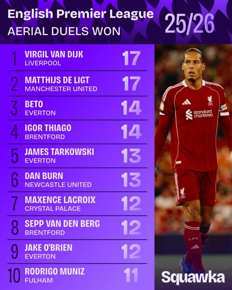 亚博体育-新赛季英超争顶榜:范迪克&德里赫特17次居首,贝托&丹-伯恩在列