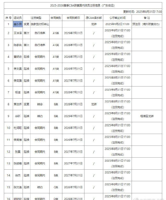 雷速体育8月31日讯 今日,广东男篮提交新赛季球员注册大名单。