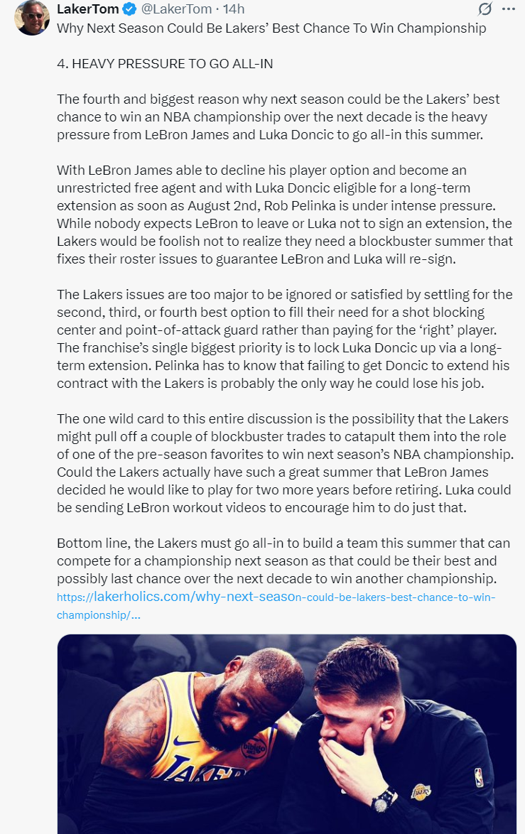 北京时间6月13日,湖人媒体Laker Tom记者汤姆-考德尔长文解析洛杉矶湖人队下赛季将是未来10年唯一的夺冠机会,他列举了四个理由,每一篇都是长篇大论,这里我就列出中心思想。