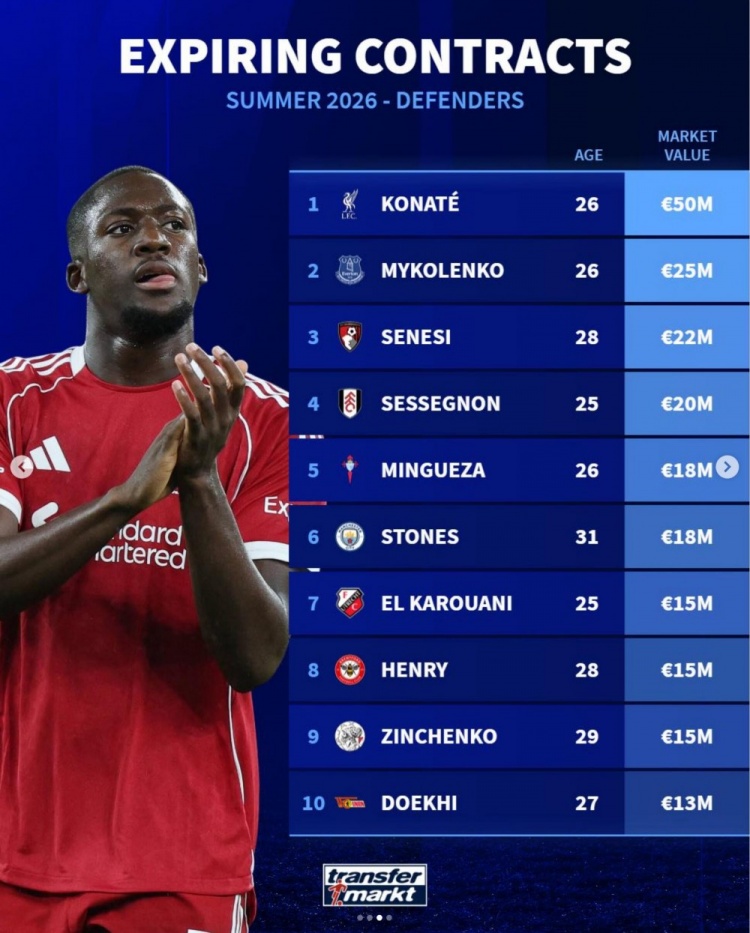 德转列今夏合同到期十大后卫球员身价,科纳特5000万欧居首