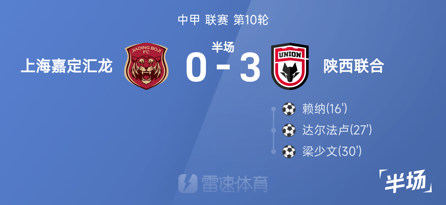 05月25日讯 25赛季中甲联赛第10轮,上海嘉定汇龙迎战陕西联合。半场战罢,双方比分暂为上海嘉定汇龙0-3陕西联合,赖纳、达尔法卢、梁少文破门建功。